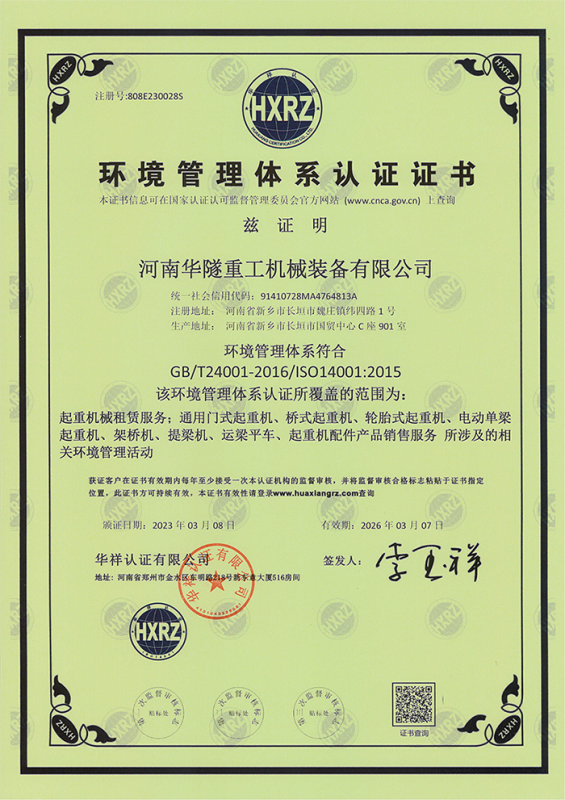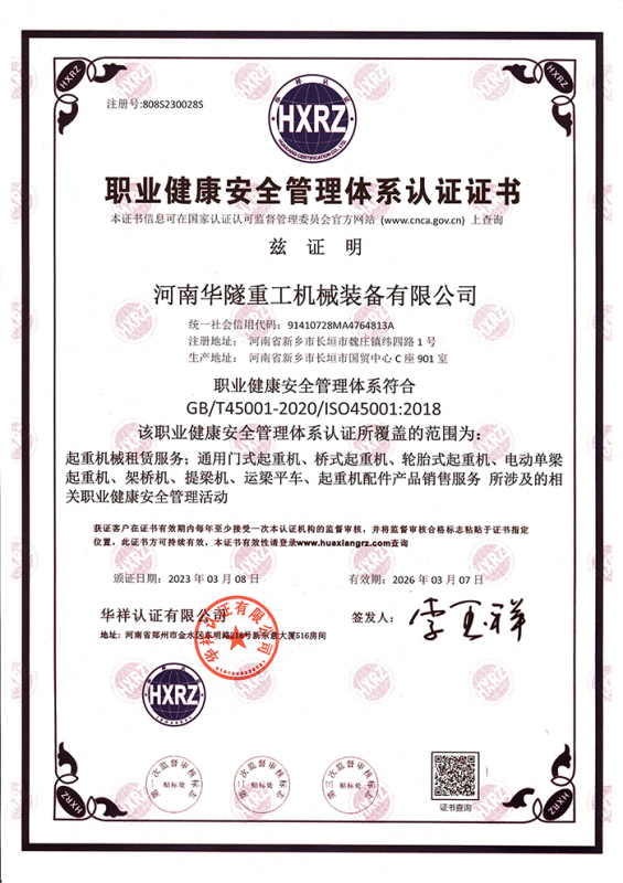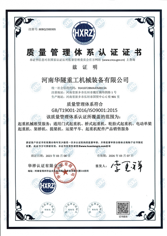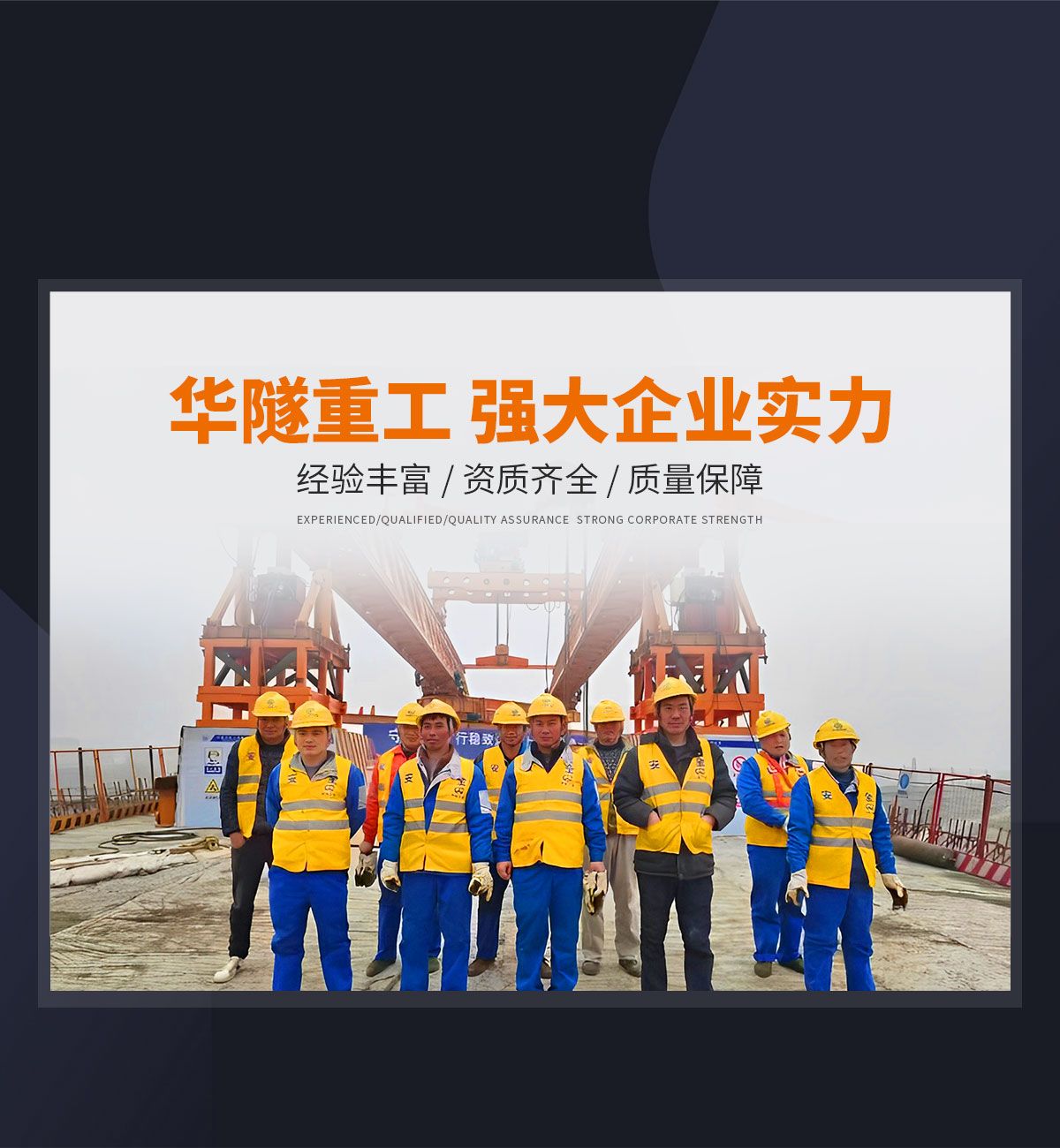 河南華隧重工機(jī)械裝備有限公司主要從事通用門式起重機(jī)、橋式起重機(jī)、電動(dòng)單梁起重機(jī),輪胎式起重機(jī)、架橋機(jī)、提梁機(jī)、遠(yuǎn)梁平車、鋼絲繩電動(dòng)萌蘆、卷揚(yáng)機(jī)、起重配件制造、銷售:起重機(jī)械租賃、安裝和維修,起重設(shè)備園收,機(jī)械設(shè)備維修,鋼結(jié)構(gòu)工程承包,橋梁工程及技術(shù)咨淘服務(wù),銷售五金制品、機(jī)電設(shè)備:建設(shè)工程監(jiān)理,建設(shè)工程設(shè)計(jì),各類工程建設(shè)活動(dòng),建筑勞務(wù)分包,建筑物折除作業(yè),施工作業(yè),工程管理服務(wù),土石方工程施工,裝如發(fā)運(yùn)。  公司已通過IS0國際質(zhì)量、環(huán)境、健康與安全三合一標(biāo)準(zhǔn)認(rèn)證,特種設(shè)備制造許可證和特種設(shè)備安裝改造維修許可證。擁有完熟的質(zhì)量管理體系。嚴(yán)格的管理制度,強(qiáng)大的生產(chǎn)能力和先進(jìn)的檢測(cè)手段,在保證產(chǎn)品質(zhì)量的同時(shí),也具備了極強(qiáng)的市場(chǎng)競爭力。  公司堅(jiān)持科技創(chuàng)新為理念,產(chǎn)品質(zhì)量為核心,注重信譽(yù),建立了減信可靠、快捷、思速。便利周到的售后服務(wù)網(wǎng)絡(luò)。  我們擁有的技術(shù)專家和技術(shù)服務(wù)隊(duì)伍為客戶提供充善的售前技術(shù)支持和全天候的售后服務(wù)體系,讓您無后顧之憂,享受一站式的超值服務(wù)。  “華隧重工,伴您成功“是華隧重工永遠(yuǎn)的宗指,真被的希望與各界朋友攜手并進(jìn)。共創(chuàng)輝準(zhǔn)!